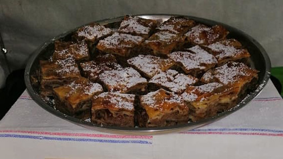 Posudu za pečenje potrebno je podmazati maslacem ili margarinom. Potom stavite tanko razvučen prvi mlinac, po njemu stavljajte ploške jabuka, posipite šećerom i cimetom, te poškropite s 3 žlice rastopljenog maslaca. Na to stavite drugi mlinac – posipite orasima, šećerom, polijte rastopljenim maslacem, te poškropite vrhnjem. Na red dolazi treći mlinac koji posipite grožđicama, šećerom, polijte maslacem i vrhnjem. S četvrtim mlincem kreće sve ispočetka – jabuke, šećer, cimet, maslac; peti mlinac – orasi, šećer, maslac, vrhnje; šesti mlinac – grožđice, šećer, maslac i vrhnje; sedmi mlinac – po treći put jabuke, šećer, cimet, maslac i vrhnje, a zadnji, osmi premažite samo vrhnjem.