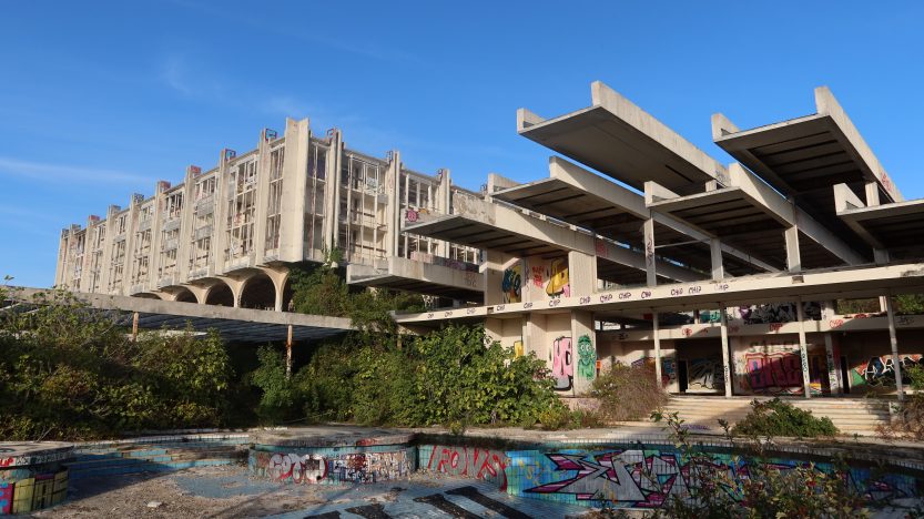 It remains a vast and open space where one can imagine the excitement of the guests when they entered the grand lobby. The pools are now empty and mostly used for graffiti displays. Since the whole complex is situated by the beach promenade between the towns of Malinska and Njivice, it if often visited and explored. But it still remains unsafe to do so.