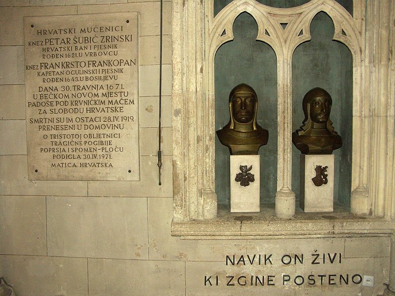 Petar Zrinski i Fran Krsto Frankopan pogubljeni su 30. travnja 1671. godine, 60-ak kilometara južno od Beča, u Novom Mjestu. Odsječene su im glave i to mačem, što je bio običaj u slučajevima pogubljenja plemića.
