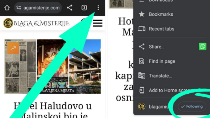 Dok ste na stranici Blaga & misterije, dodirnite tri točke u gornjem desnom kutu Chrome preglednika. Ovo će otvoriti padajući izbornik. U izborniku odaberite posljednju opciju “Prati” (ili “Follow”, ovisno o jeziku vašeg uređaja).