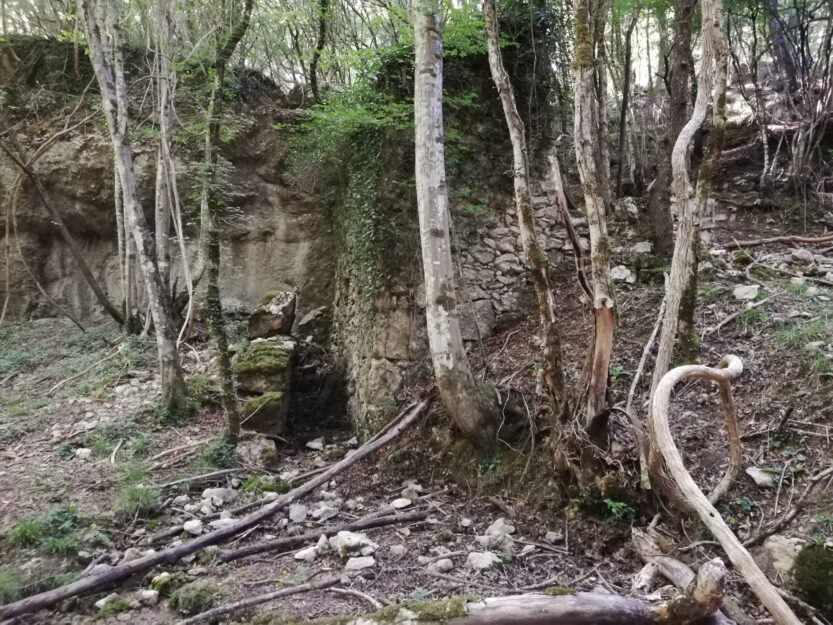 Puteljak na koji ste skrenuli dovest će vas do betonske kućice, a od nje se trebate lijevo spuštati kako bi došli do mlina. U blizini betonske kućice uočili smo dosta suhozida. Jedan od podzida izgleda kao podzid nekog starog puta.