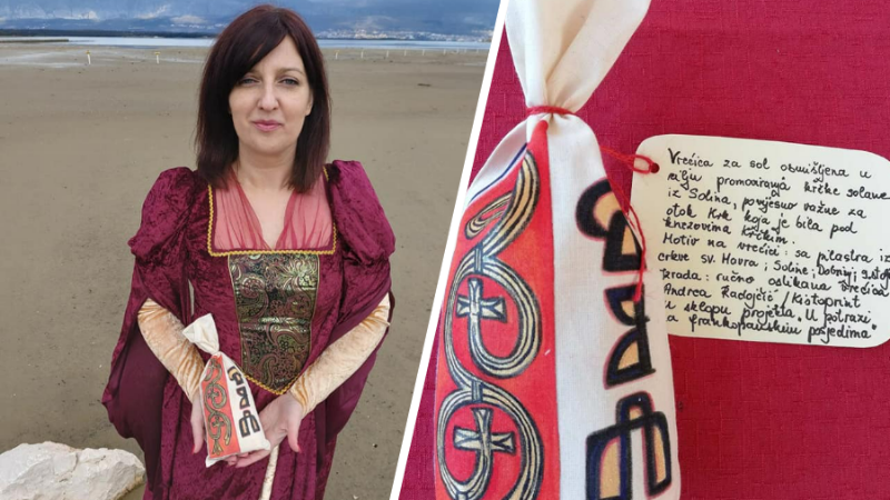Kako već dulje vrijeme surađujem s Andreom Radojčić na projektu “U potrazi za frankopanskim posjedima”, zamolio sam ju da osmisli vrećicu soli koja će prezentirati solane. Andrea Radojčić se bavi oslikavanje tekstila i podučavanjem glagoljice, te smo zaključili da bi bilo najbolje uz neki motiv koji je vezan za ovo područje, uključiti i glagoljicu, kako bi se i ona promovirala kao kulturna baština i pismo kojim su pisali Frankopani. “Frankopani su pisali glagoljicom i smatra se da je na Modrušu bila tiskara te da su mnoge isprave vezane uz pavlinski samostan pisane glagoljicom. Sam Bernardin Frankopan dao je napisati Modruški urbar 1486. godine na glagoljici. Kolijevkom glagoljice smatra se otok Krk, na kojem je sačuvano 469 rukopisnih glagoljskih djela. Gdje god krenemo možemo pronaći glagoljske natpise. Moj prvi doticaj s glagoljicom počinje 2014. godine kada sudjelujem u inicijativi vl. Ante Luketića da se glagoljska baština obnovi. Te godine sam napravila radionicu sa čestitkama na glagoljici sa školskom djecom pod nazivom “Glagoljično božićno ruho”, u suradnji sa učiteljicom Mirjnom Grubišić. Tada sam shvatila kako treba ići dalje, jer je potencijal velik“, rekla je Andrea Radojčić. 3