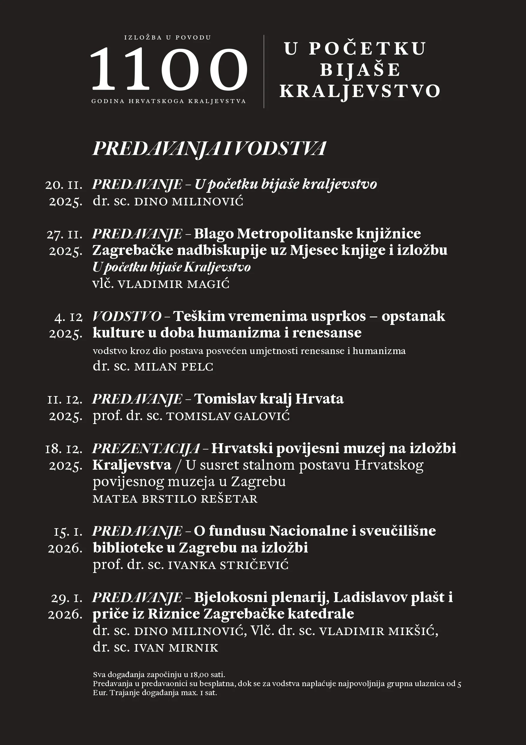 Izložba “U početku bijaše kraljevstvo”, postavljena u Klovićevim dvorima povodom 1100 godina hrvatskog kraljevstva, otvorila je prostor za novu razinu razumijevanja nacionalne povijesti. Riječ je o izložbi koja okuplja rijetke predmete, vrijedne rukopise i reprezentativne umjetnine te rekonstruira jedno od najvažnijih razdoblja hrvatske državnosti. Kako bi posjetitelji dobili potpuniju sliku konteksta i značenja izloženog materijala, pokreće se ciklus predavanja i vodstava u suradnji s istaknutim stručnjacima iz različitih područja.