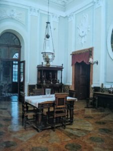 Tlocrt dvorca je kvadrat sa stranicom 23 metra. Iz sredine tlocrta izdiže se centralna dvorana visoka kao dvije etaže s bazilikalnim osvjetljenjem. Oko središnje dvorane nižu se sve ostale prostorije.